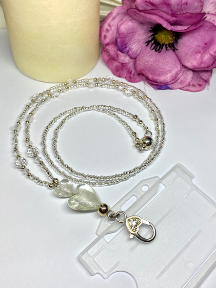 This lanyard is a beautiful silver-white colour. It is crafted with a silver foil lampwork heart bead, sparkling white shamballa beads, and silver spacer beads. The lanyard features a magnetic clasp for easy use. Only high-quality precious Czech seed beads have been used. These beads are uniform in size, giving the lanyard a polished finish. These beads are silver-lined and don't need any additional beads to make them shine. This lanyard is 51cm/20 inches long from end to end. If you measure from the back of your neck down, the lobster claw clasp will sit at that point.